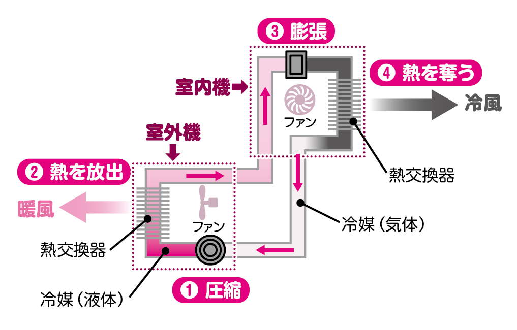 ①から④を繰り返すことで、部屋の熱を外に運び出している。