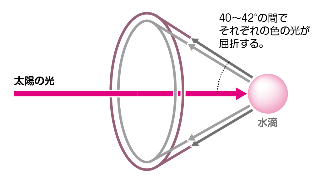 虹は、空気中の雨粒(水滴)に太陽の光が当たったときに起こる現象です。光は空気中から水滴に進むと、折れ曲がり屈折します。太陽の光は、さまざまな色(紫、藍、青、緑、黄、だいだい、赤)の光が集まったものです。それぞれの色の光が屈折する角度は40~42°の間で少しずつ異なります。水滴は丸いので屈折した各色の光は上下左右、斜めと円形に進み、そのうち地面より上の半円が虹として見えるのです。