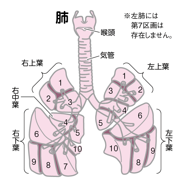 図 肺は左右合わせて19個の肺区画、腎臓は10個の腎区画から構成されている。