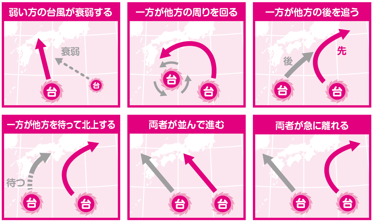 図 2つの台風が接近したときの動きは、6つのパターンに分けられる。