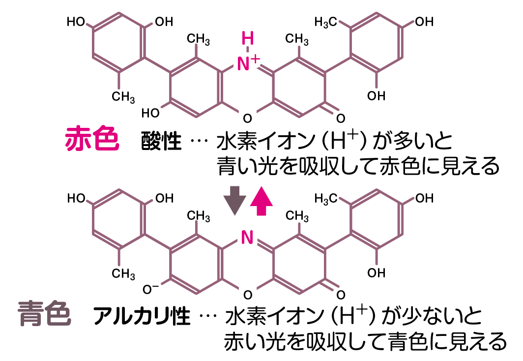 リトマス試験紙には、地衣類(菌類と藻類の共生生物)の一種であるリトマスゴケから取り出した染料がしみこませてあります(現在では化学合成が多い)。その成分のひとつ「アゾリトミン」という色素の分子は、酸性やアルカリ性に反応して原子分子のつながり方が変化します(図)。すると吸収する光の色(波長)が変わるので、色が変わるのです。
