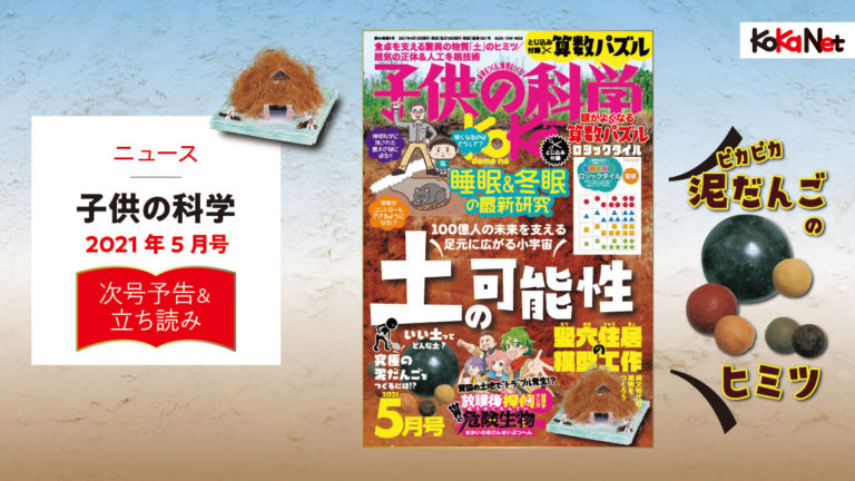春が訪れ、「土に触れたい」と感じている人も多いのでは? どこにでもあり、誰でも知っていると思われがちな土ですが、その実態は謎だらけ。4月9日発売、5月号の特集では、地球上にある土の種類、植物との関係、世界の食糧生産事情、“最強の泥だんご”まで、知られざる土のお話をご紹介します。さらに、「眠り」のヒミツに迫る「睡眠」と「冬眠」の最新研究、論理的思考力を育てる「算数パズル」付録にも注目!