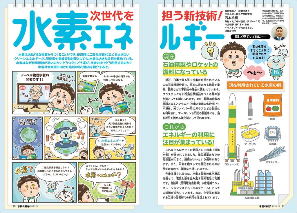 子供の科学2021年12月号(11/10発売)では、クリーンエネルギーとして注目されている「水素エネルギー」を特集! なぜ注目されているのか? どうやってつくり、運ぶのか? 課題は何か? 水素社会実現に向けた最新の取り組みや未来予想図を紹介! トヨタ自動車へのインタビューも。