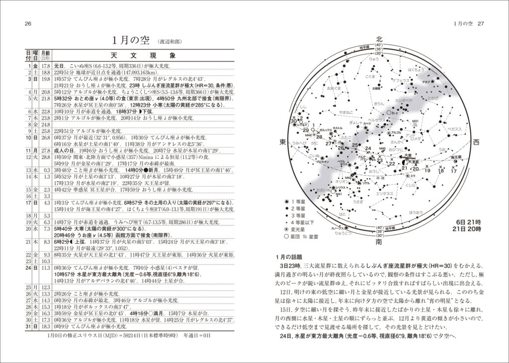 2021年版の巻頭口絵では、2020年の7月には肉眼でも長大な彗星の尾を見ることができた“ネオワイズ彗星”の画像や、習志野市に落下した隕石の落下をとらえた火球写真などを掲載。さらに日本人によって発見された彗星(岩本彗星)や超新星の画像も掲載しています。