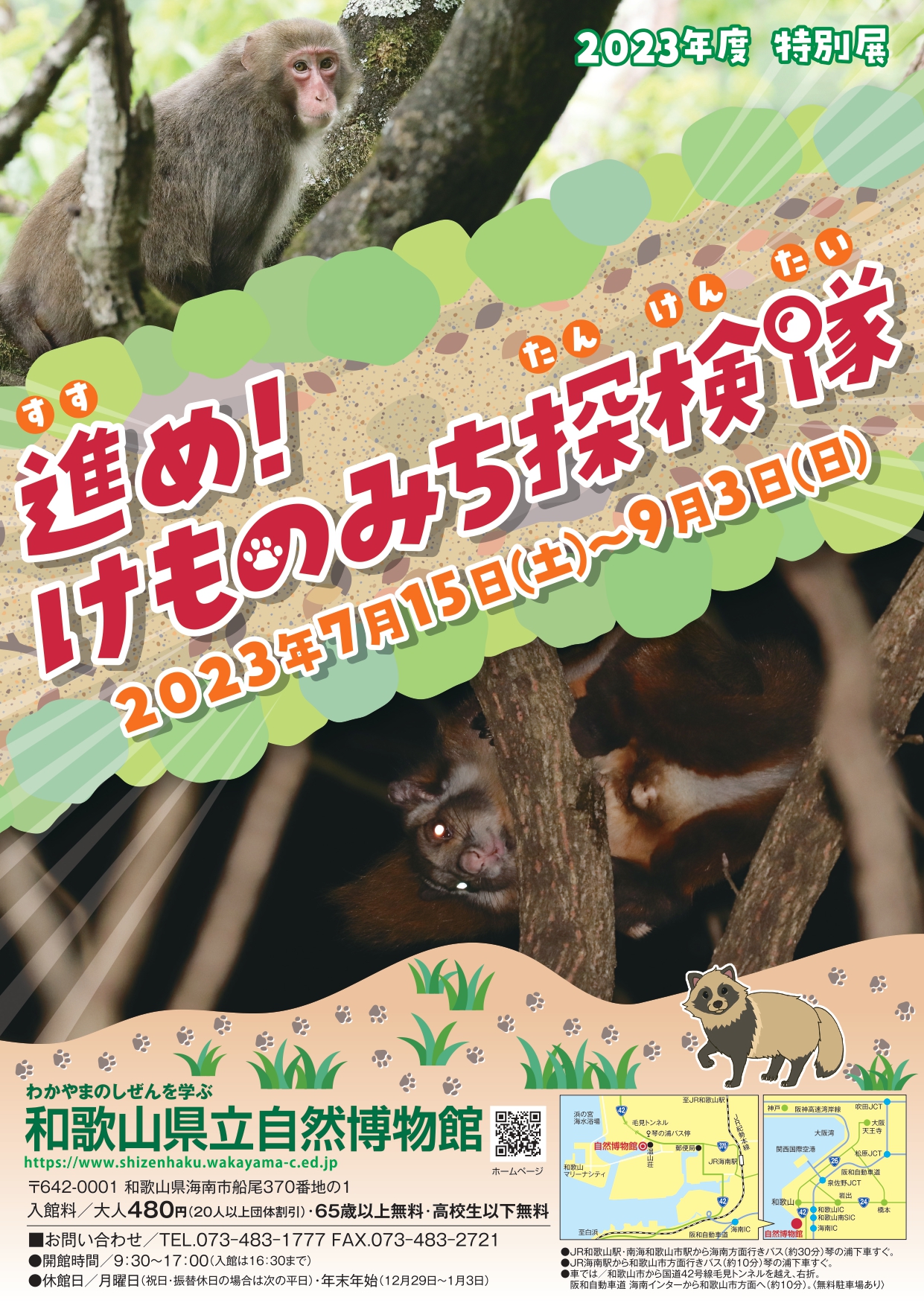 今回の特別展は「けもの」が主役!和歌山にはどんなけものがいるの?この夏、自然博物館でけものの見つけ方を学ぼう♪さあ、探して、調べて、記録しよう!いざ進め!けものみち探検隊!