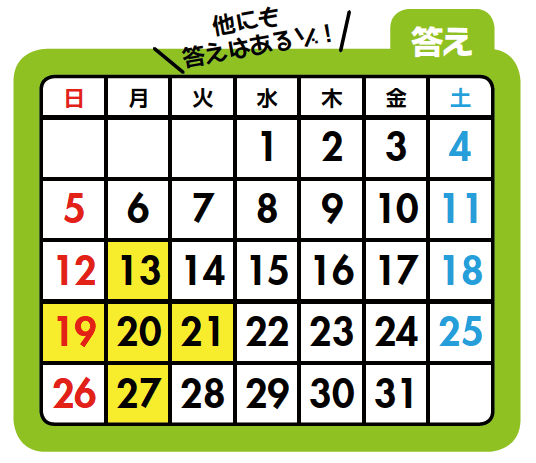 カレンダーは、横方向、右に見ていくと数が1ずつ増えていく。では、縦に見てみるとどうだろう? 縦に一段下に行くということは、1週間進むということ。1週間は7日だから、7増えることになる。このような決まりを使って考えるんだ。