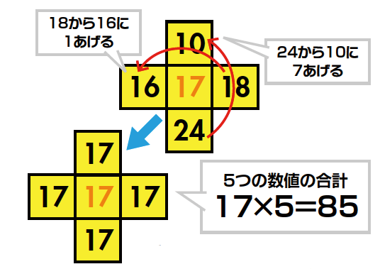 この考え方を利用して、ある数の5倍が100になると考えれば……「□×5=100」。□=20ということがわかる。つまり、「20」を中心とした十字で囲めば、そこのかたまりが「100」になる!