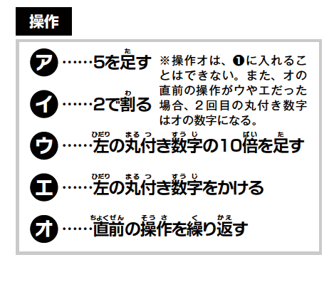 ワクの中に、ア~オの操作を1つずつ当てはめて、計算結果が正しくなるようにしよう。どの操作も一度ずつ使うこと。計算途中に、0よりも小さな数や、分数・小数が出てきてはいけないよ。