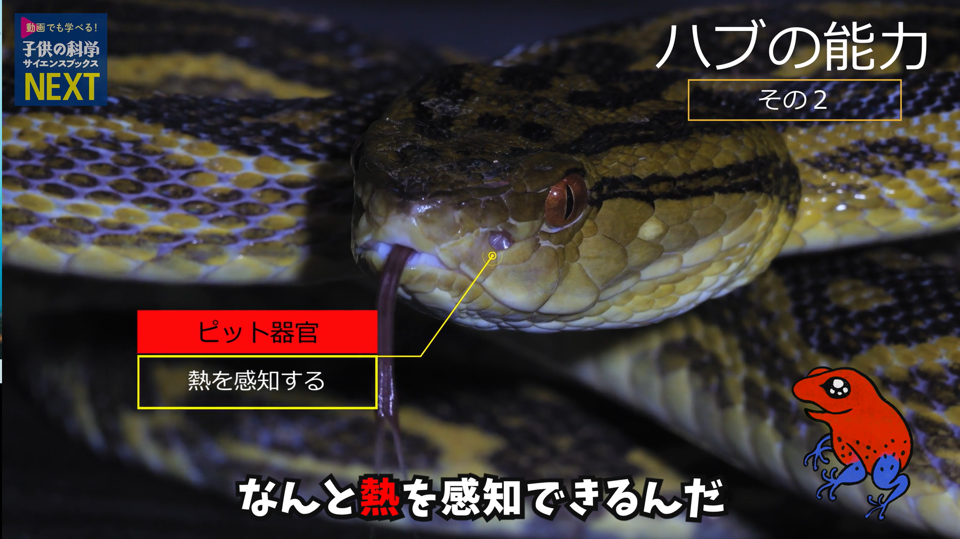 子供の科学サイエンスブックスNEXT『刺す! 咬む! 防御する! 猛毒をもつ危険生物』では、そんな身近に生息する有毒生物をはじめ、世界各地の珍しい有毒生物まで、約100種を紹介。さらに毒のしくみも詳しく解説しています。 動画では、イチゴヤドクガエルのかわいいキャラクターが案内役となり、本書に登場する危険生物の一部を動画で紹介。その他、毒ヘビとして知られるハブの採毒シーンや、ハブが鋭い牙をむき出しにして熱源に襲いかかるシーンなど、他では滅多に見ることができない、貴重な場面を収録しています。