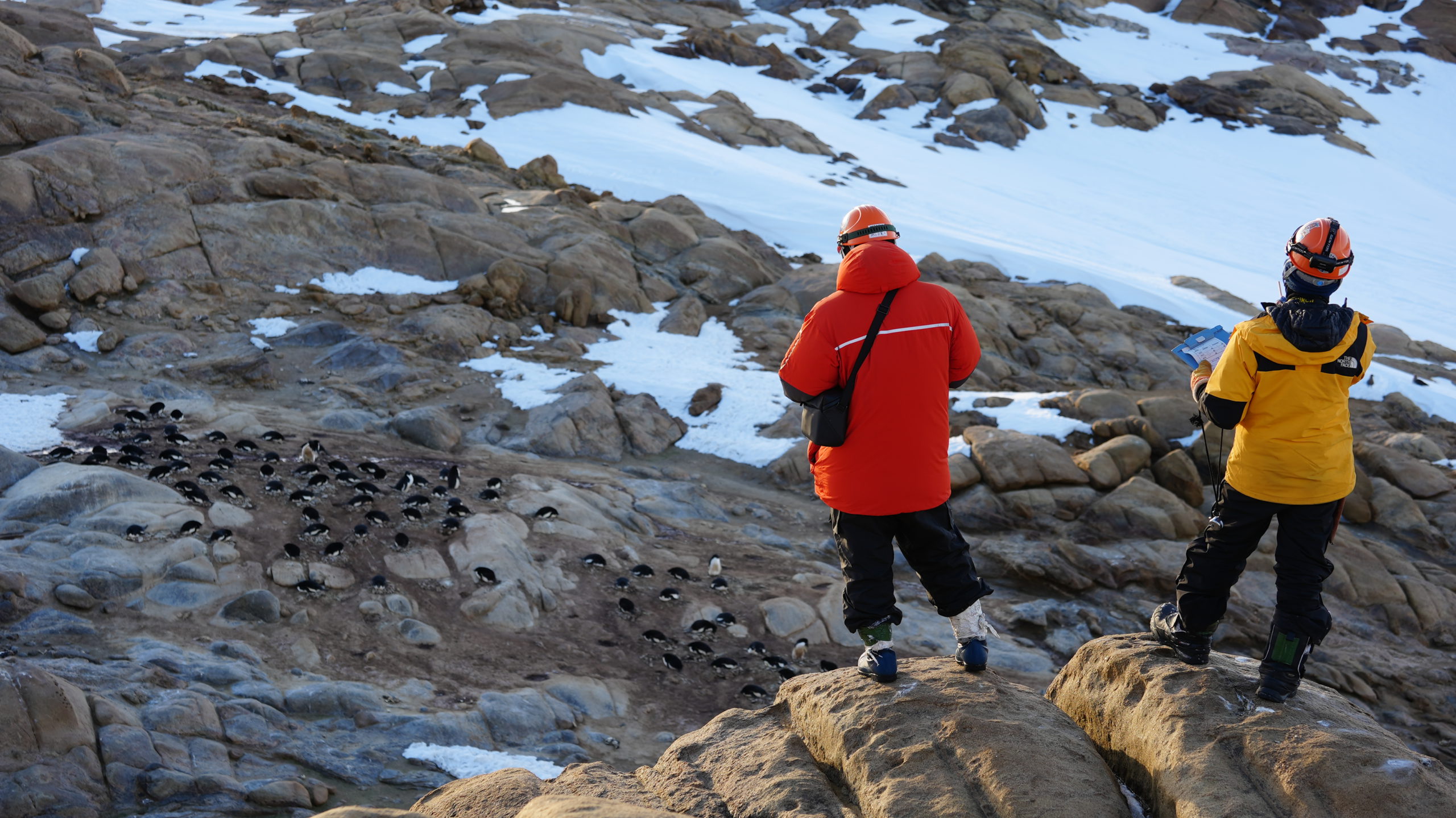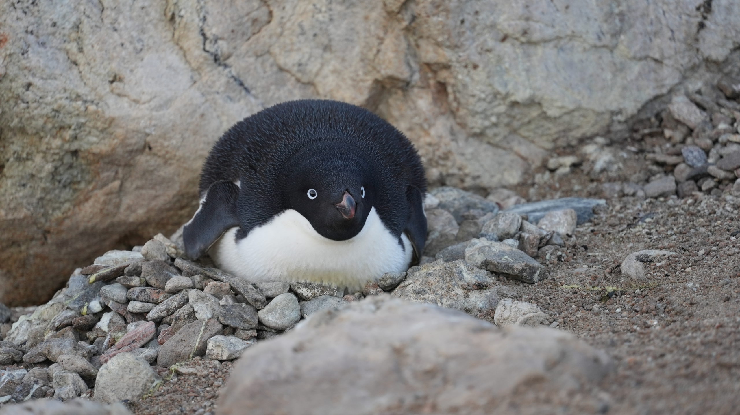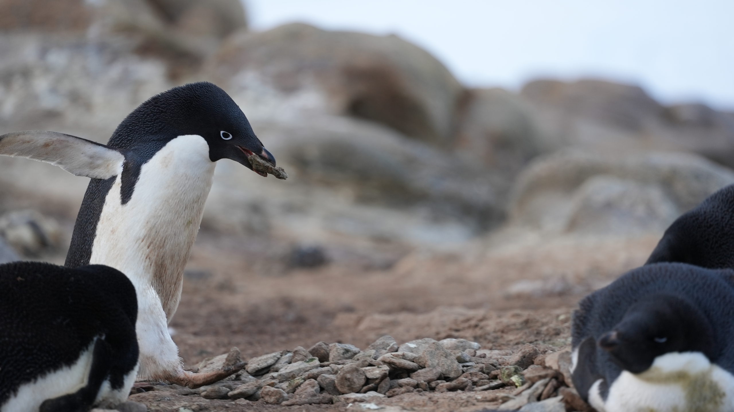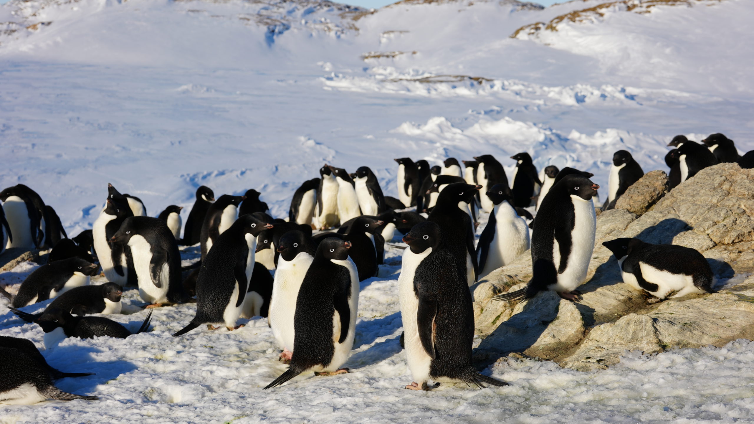 南極の夏が始まる11月、アデリーペンギンが海氷上を一列に移動する姿が見られるようになります。昭和基地周辺には営巣地(ルッカリー)が点在しており、ペンギンが子育てのために集まってくるのです。観測隊では、毎年10か所以上のルッカリーを訪れ、ペンギンの個体数と巣の数を調査し、その変化を観察しています。
