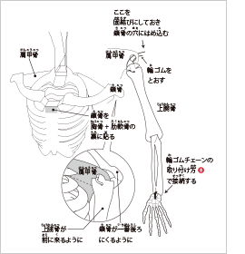 骨格模型ができたら、自分の体を触りながら、骨の数や形を調べてみよう。肩の後ろについている肩甲骨はどんな形をしている? 手や足の付け根を触ってみると、どんな形の骨がいくつぐらい触れるかな? 骨格模型を見ながらチェックしていこう。