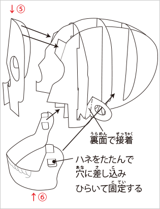 型紙⑤を前面に貼りつけ、⑥を右の図のように組み合わせて完成です。