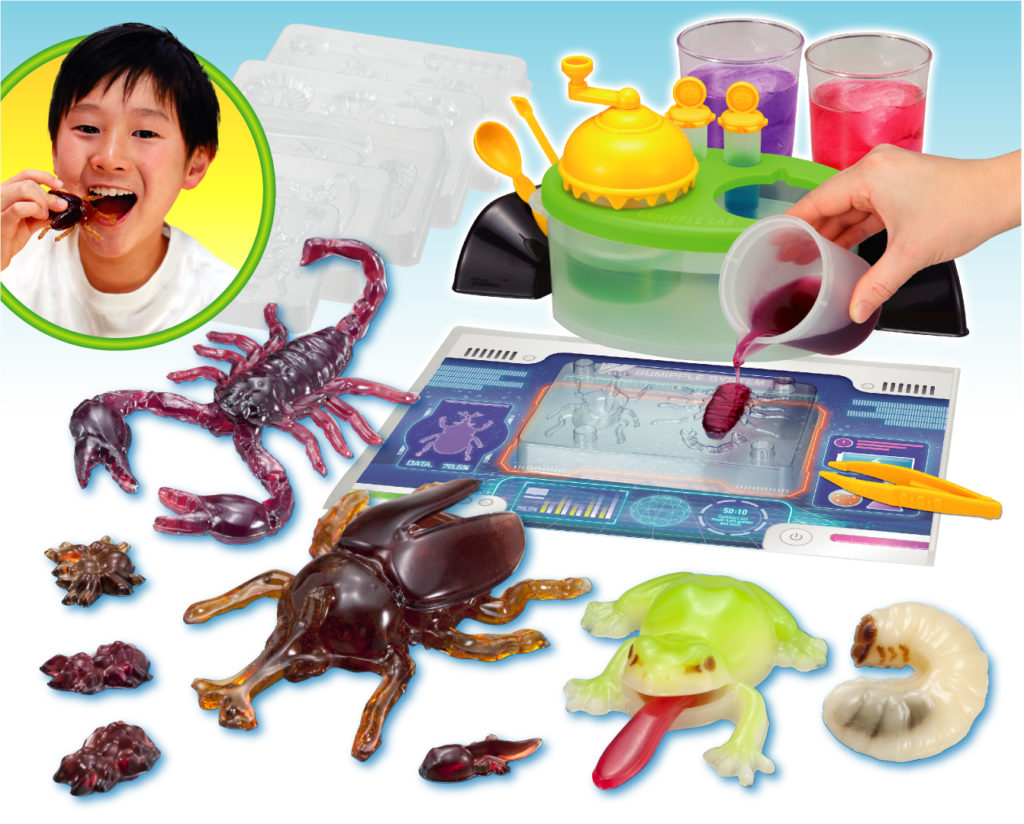 「グミップルラボ ドキッとステーション」は、ジュースやシロップなどの色付き飲料とゼラチンを混ぜてグミ液をつくり、専用の型を使って固めることで、リアルでおいしいグミがつくれる。カブトムシやサソリ、カエルなどにそっくりなグミをつくって、みんなで食べよう!
