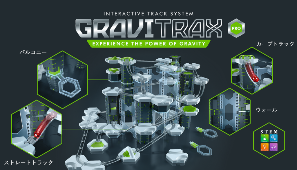 「GraviTrax PRO」は、タイルやプレート、トラックといったパーツを組み合わせてコースを自分でつくり、ボールを転がすおもちゃだ。重力や磁力などの物理法則がどのように影響するかを考えながら、ボールの進み方を予測する力が試されるぞ。いろいろなコースをつくって楽しもう!