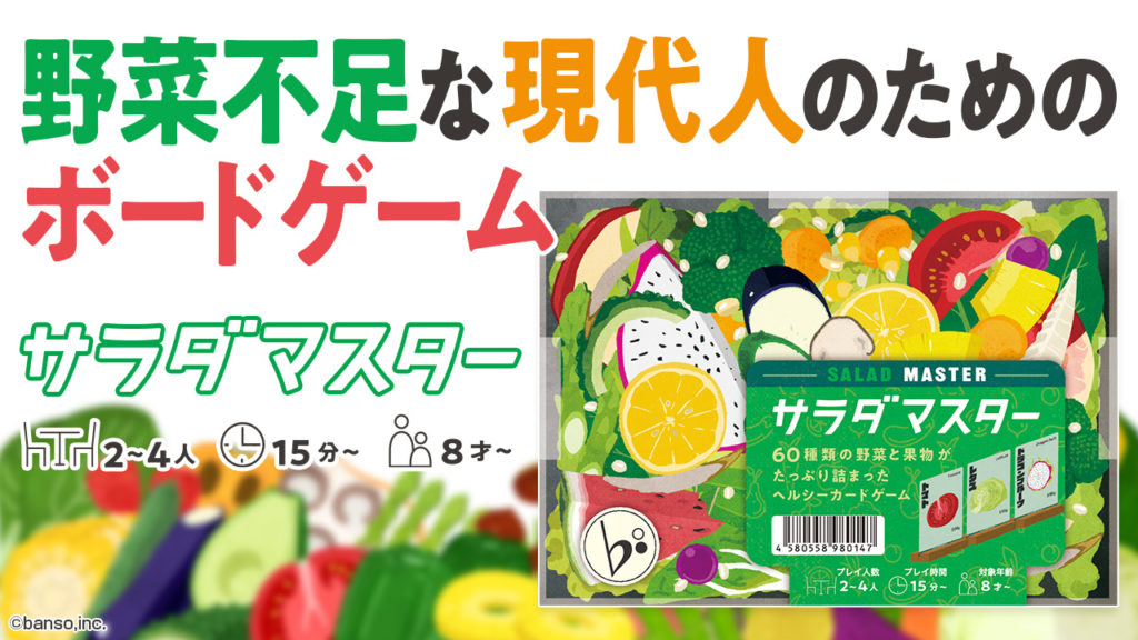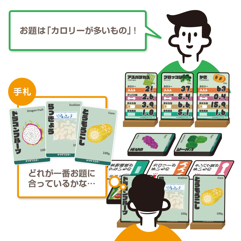 「サラダマスター」は野菜の成分をくらべて遊ぶボードゲームだ。お題にあった成分を持つと思われる野菜のカードを、自分の手札から出していくよ。お題に一番合っていた人がお題が書かれたカードをゲットして、一番多く集めた人が勝ち。遊んでいるうちに野菜に詳しくなって、キミも野菜ソムリエになれるかも!?