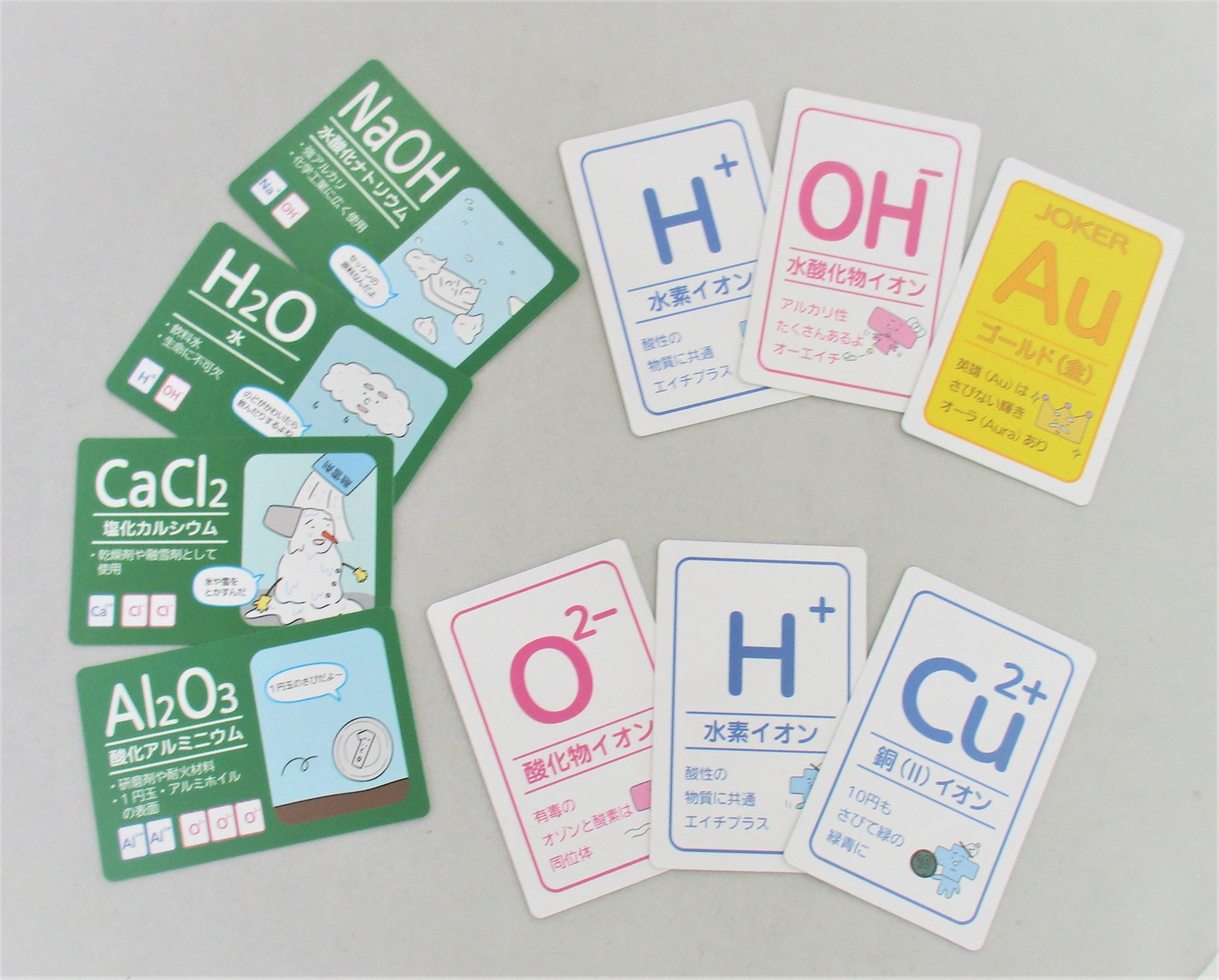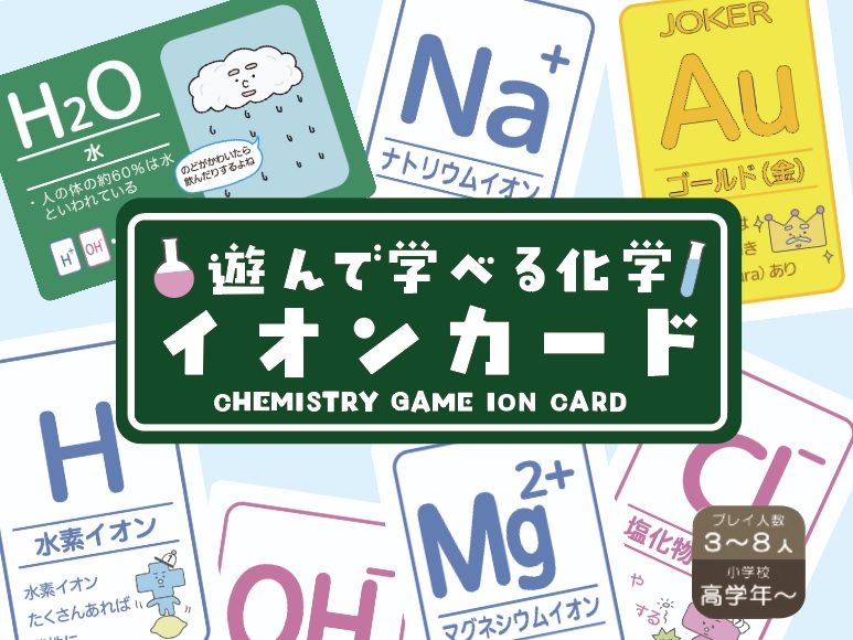 「遊んで学べる化学 イオンカード2021年版」は陽(+)イオンのカードと、陰(-)イオンのカードを組み合わせて、いろいろな化合物をつくって遊ぶカードゲームだ。トランプの神経衰弱やセブンブリッジのようにして遊ぶことができるぞ。楽しみながら化学を学んじゃおう!