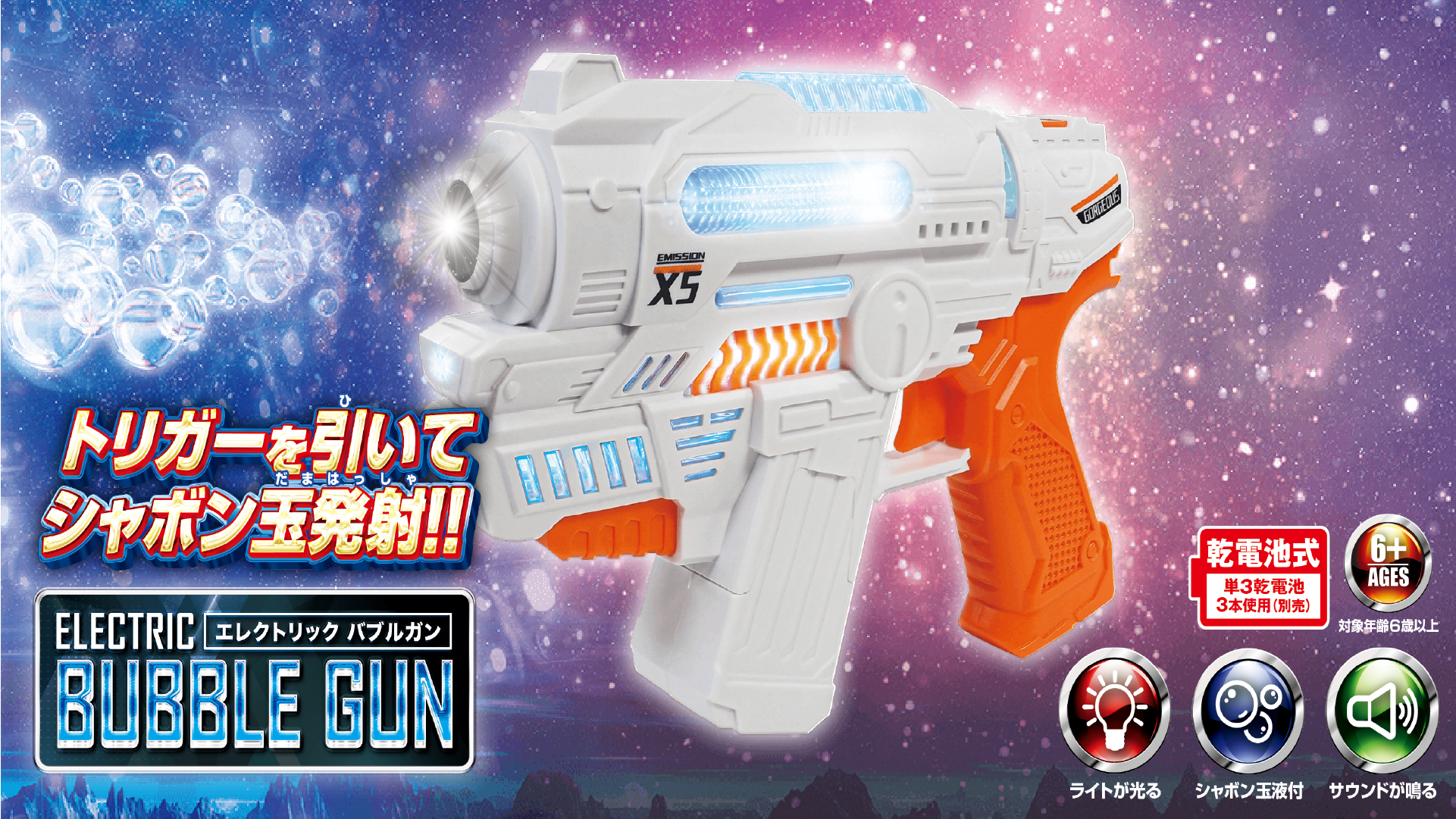 「エレクトリックバブルガン」は、シャボン玉を発射して楽しむおもちゃだ。マガジンクリップにシャボンマガジンボトルを装填してトリガーを引けば、シャボン玉が発射されるぞ。そのときにグラデーションライトが光って、迫力あるサウンドが流れるので盛り上がること間違いなし! 本格的なバブルアクションが楽しめるぞ!