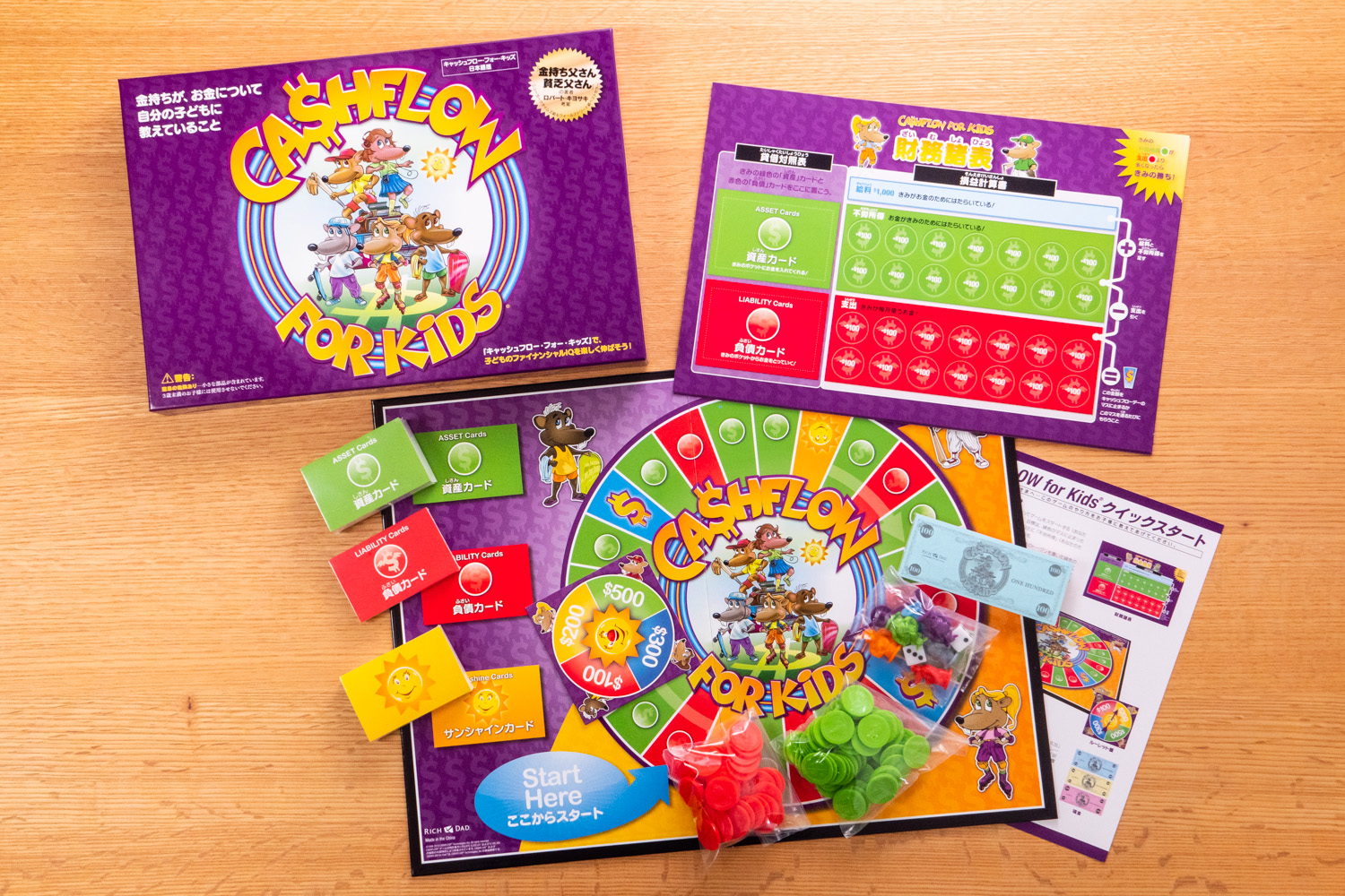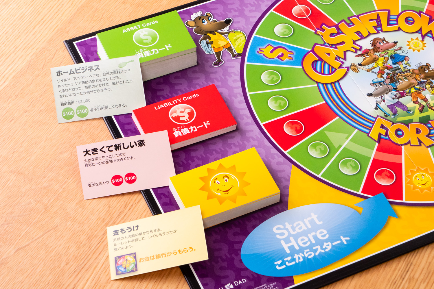 「キャッシュフロー・フォー・キッズ」は遊びながらお金についての基礎知識が学べるボードゲームで、書籍『金持ち父さん 貧乏父さん』で有名なロバート・キヨサキさんが考案。自分の仕事から得られる「給料」を使うことからスタートして、起業や投資など、お金を自分のために使う方法を、ゲームで楽しみながら学んでいくことができるぞ!