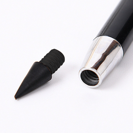 「エターナルペンシル」は、削ることなく、長時間書き続けることができる、えんぴつのような筆記具だ。黒煙を含んだ特殊合金のペン先の粒子が、紙との摩擦で筆跡となるので、芯の摩耗がとても少ないのが特徴。もちろん普通の消しゴムで消すことができる。これ1本あれば安心だね!