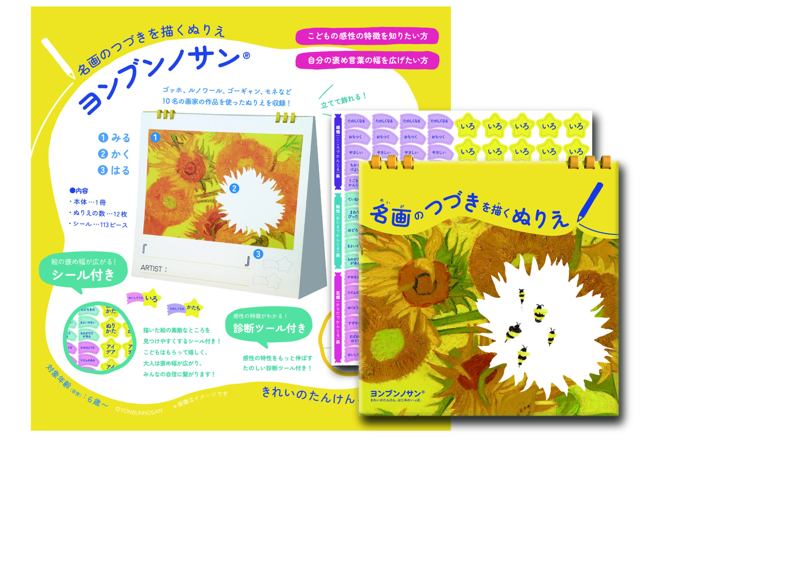 「ヨンブンノサン」は、名画の続きを自由に想像して描くぬりえだ。ゴッホやルノワール、モネなどによる名画の4分の1が空白状態になっているので、それを色鉛筆などで書き足していく。どんな絵を描くかはその人次第。完成させた後に、美術館や美術書で本物と見比べてみても楽しいぞ。