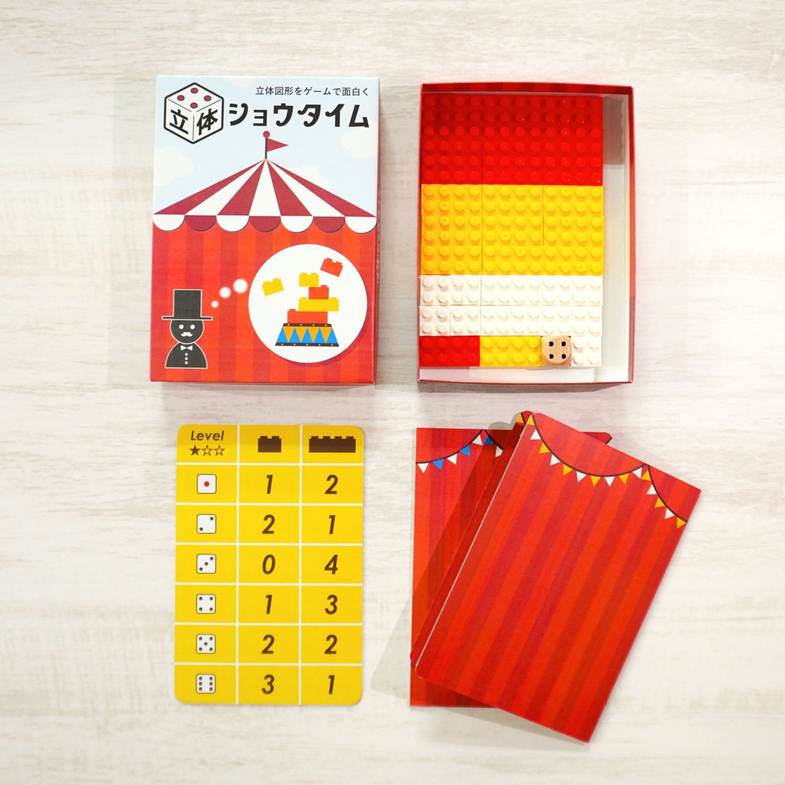 舞台はサーカス、相手のつくった立体の正体を探るパーティー系算数ゲームが登場。指先で立体に触れたり、立体の特徴を言葉で聞いたり、制限のある中なかで形を想像してブロックを再現し、「ショウタイム!」のかけ声で披露! 果たしてキミは立体の正体を見み破れるかな? 算数で大切な「空間認識力」を遊びながら鍛えよう。