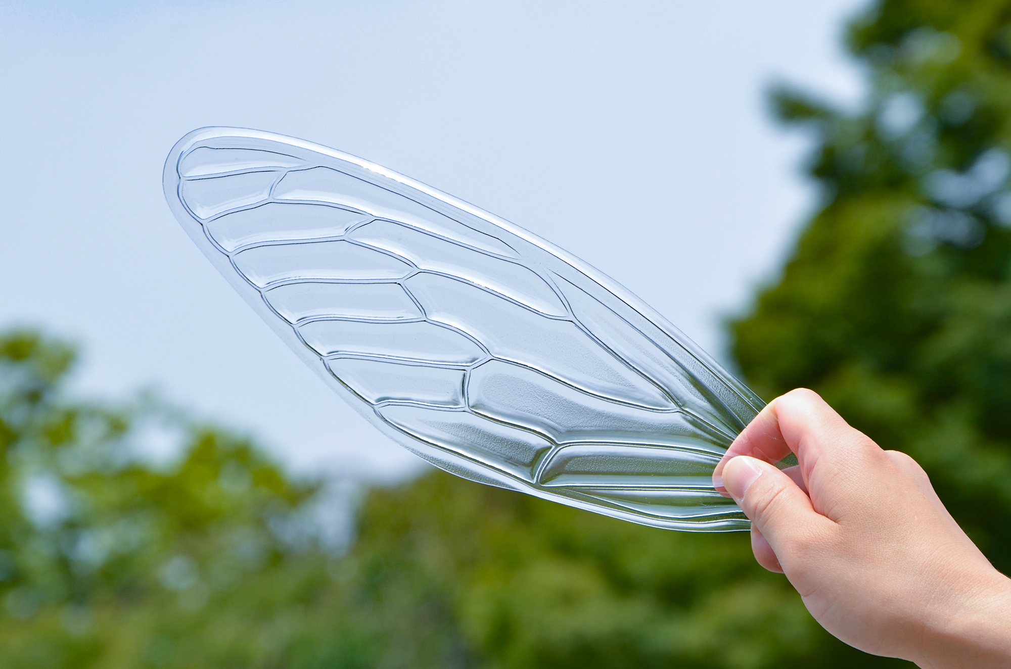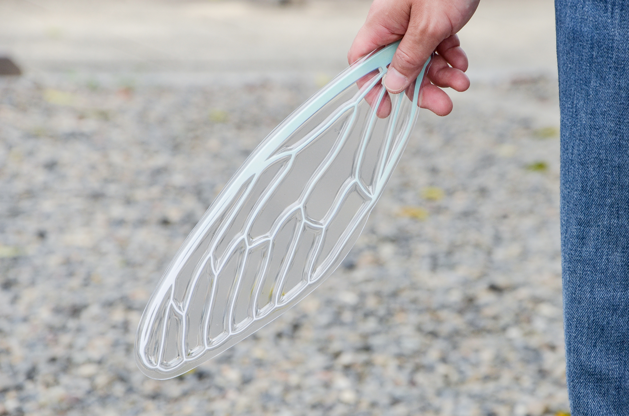 分に凹凸をつけて強度を上げている。大きなセミの翅からそよぐ気持ちのよい風が、夏の終わりを運んでくれるはず。