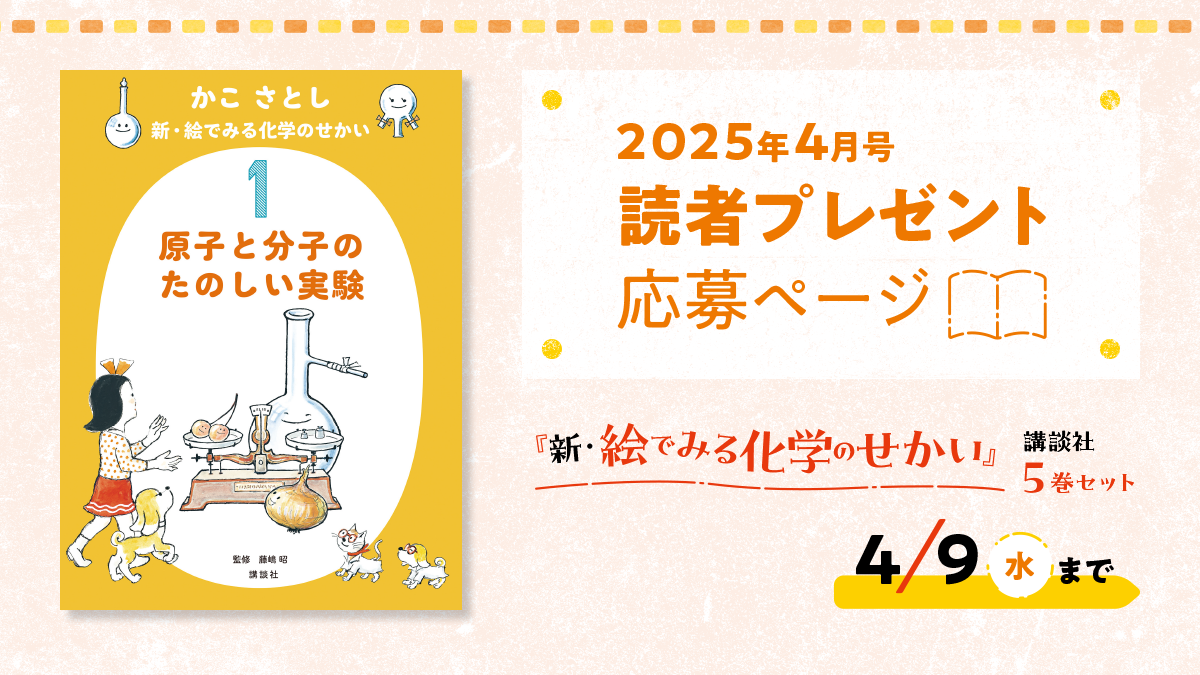 今回は読者プレゼントとして、「かこさとし 新・絵でみる化学のせかい」5巻をセットにして1名様にプレゼントします。応募締め切りは、4月9日(水)まで。当選者の発表は発送をもって代えさせていただきます。