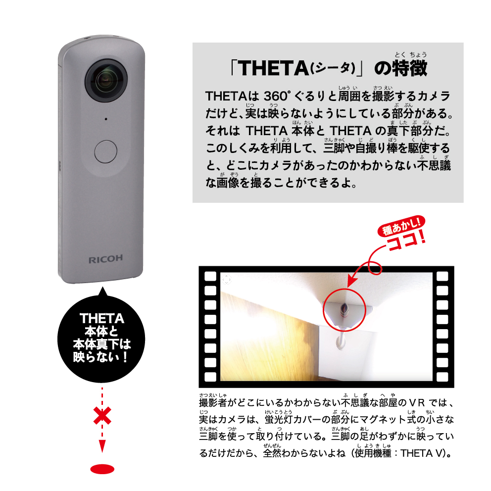 子供の科学12月号60ページ~で紹介。360°カメラ「THETA(シータ)」で撮影した作例を一挙に紹介するよ。屋上、部屋、冷蔵庫&冷凍庫、集合写真がどんなVRになっているのかチェックしよう。本誌と合わせて見るのがオススメ♪(このコンテンツにはBGMがついています。お好みに合わせてオン/オフしてください)。